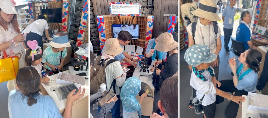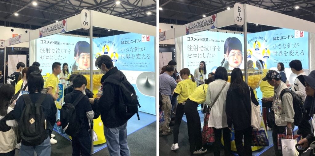 私たちの展示ブースにはご家族での来場も多く、特に小さなお子さまは大きな顕微鏡と「痛くない貼る注射」の体験に興味深々。「ほんまや!痛くない!」「早く注射がマイクロニードルになったらええね!」という賑やかな声と笑顔は閉場まで途切れることなく、コスメディ製薬がマイクロニードル技術でめざす「未来の医療」について、多くの皆さまとお話しすることができました。