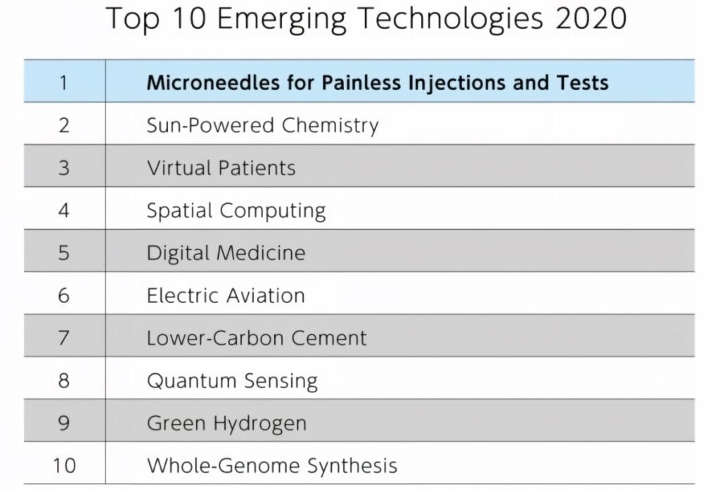 この社会課題を解決し、安心安全な医療ケアを実現するのが、注射に代わる新技術「マイクロニードル」です。マイクロニードルは、2020年の世界経済フォーラムで「世界を変える新興テクノロジートップ10」※1に選出。使用にあたって高価な機器や高度なトレーニングを必要としないため、医療サービスが行き届いていない地域での検査や治療に役立ち「医療がより身近なものとなる技術」と紹介され、注目と期待を集めています。