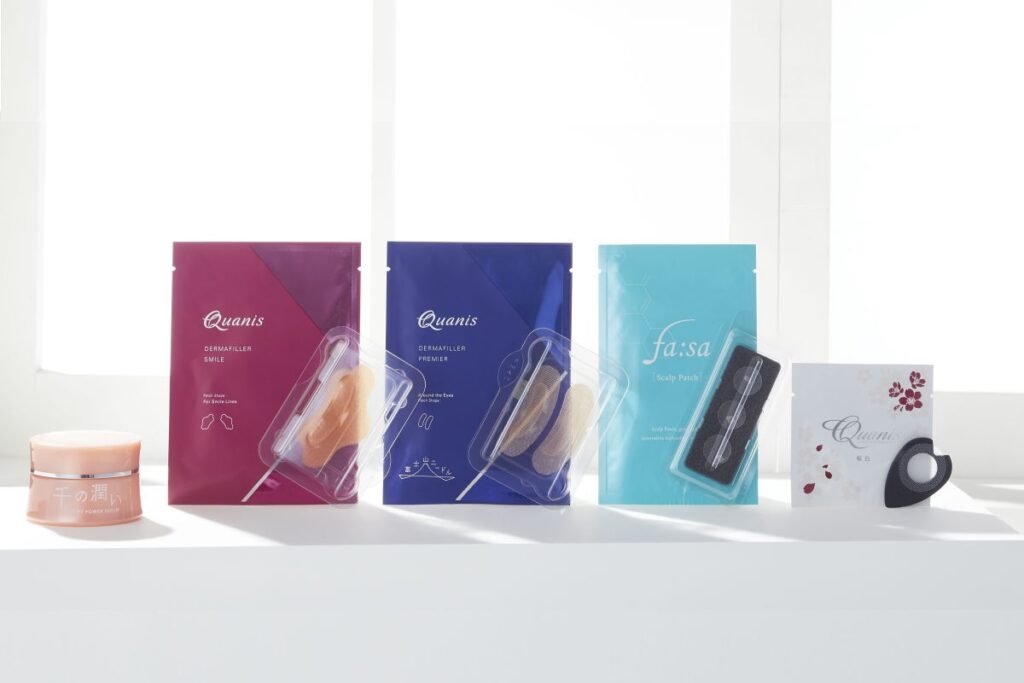 コスメディ製薬が開発した「溶解型マイクロニードル」は、皮膚中の成分ヒアルロン酸を基材とし、針が皮膚内の水分で溶けるマイクロニードル。この「溶解型マイクロニードル」を製品として事業化するため、承認プロセスに時間を要する医薬品や医療機器より先に、短期間で製品化できる美容領域に展開。工業的製法を確立し、2008年に世界初※1「マイクロニードル化粧品」として社会実装しました。